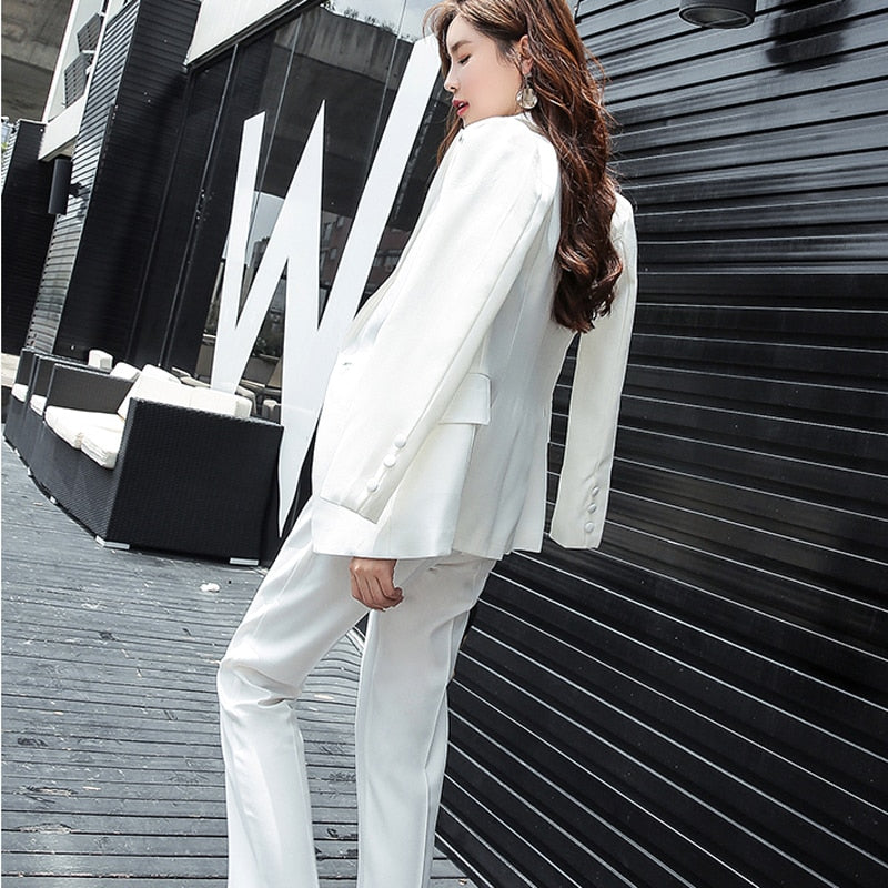 Classic Double Breasted White Women Pant Suits Notched Collar Blazer Jacket & Straight Pants Office Ladies Female Sets