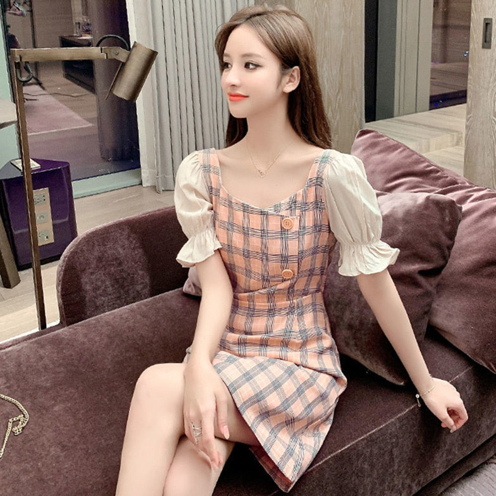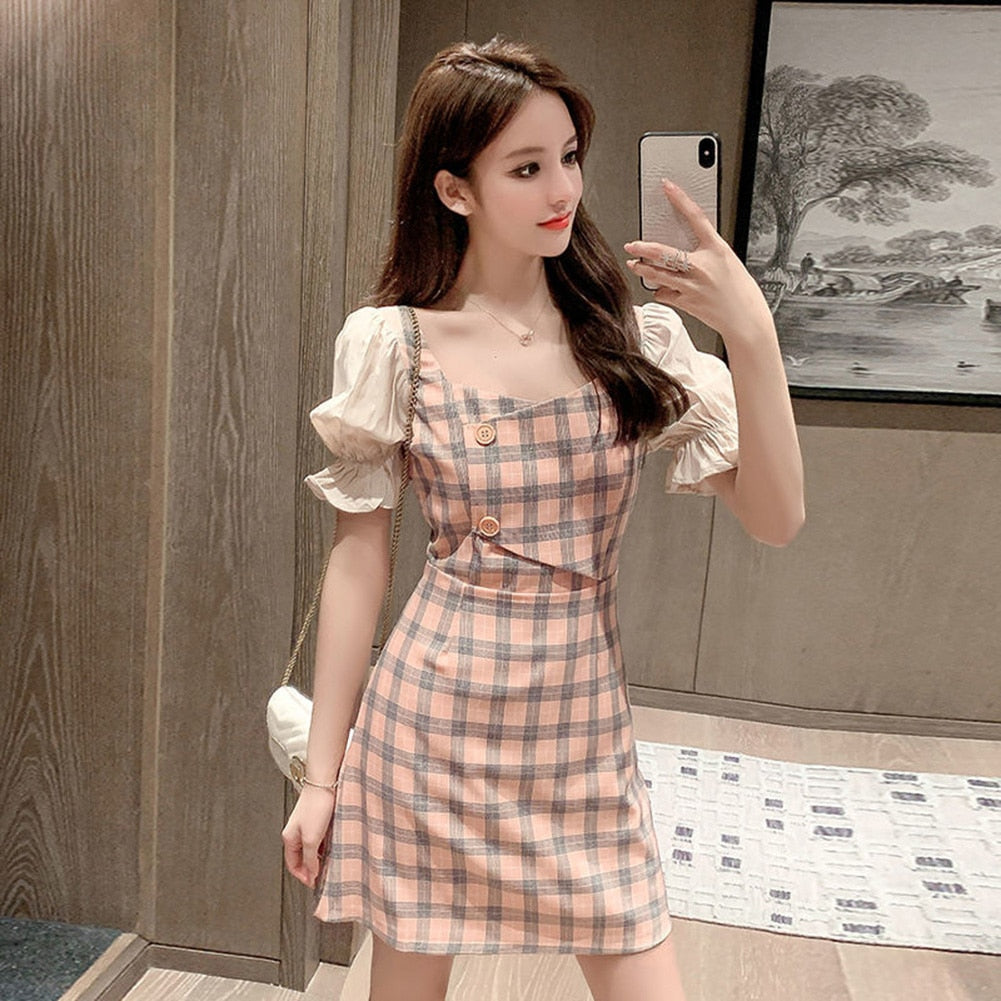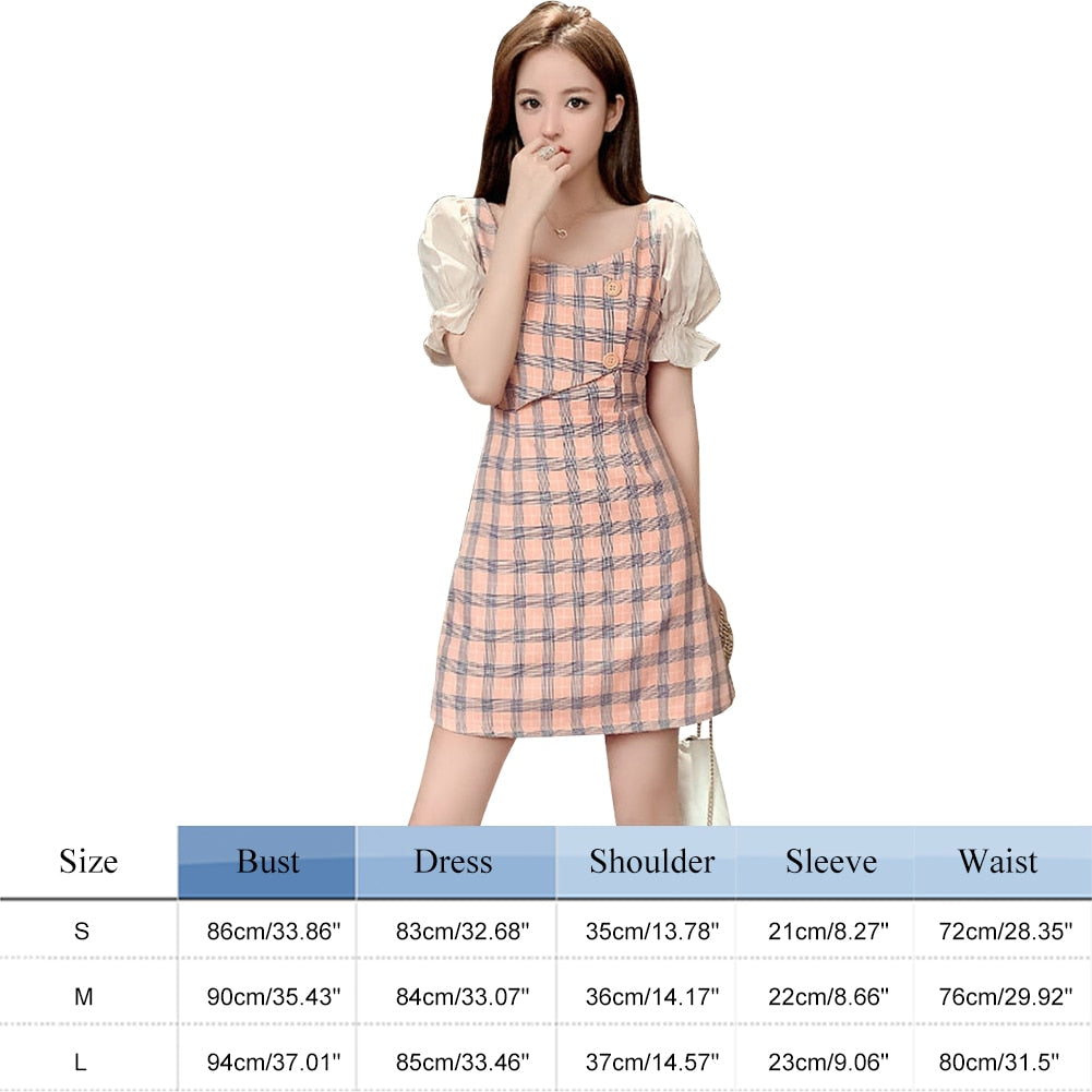 Fashion Plaid Pattern Puff Sleeve Dress Korean Women Elegant Chiffon Square Collar Splicing Chiffon Ruffles A-line Dress