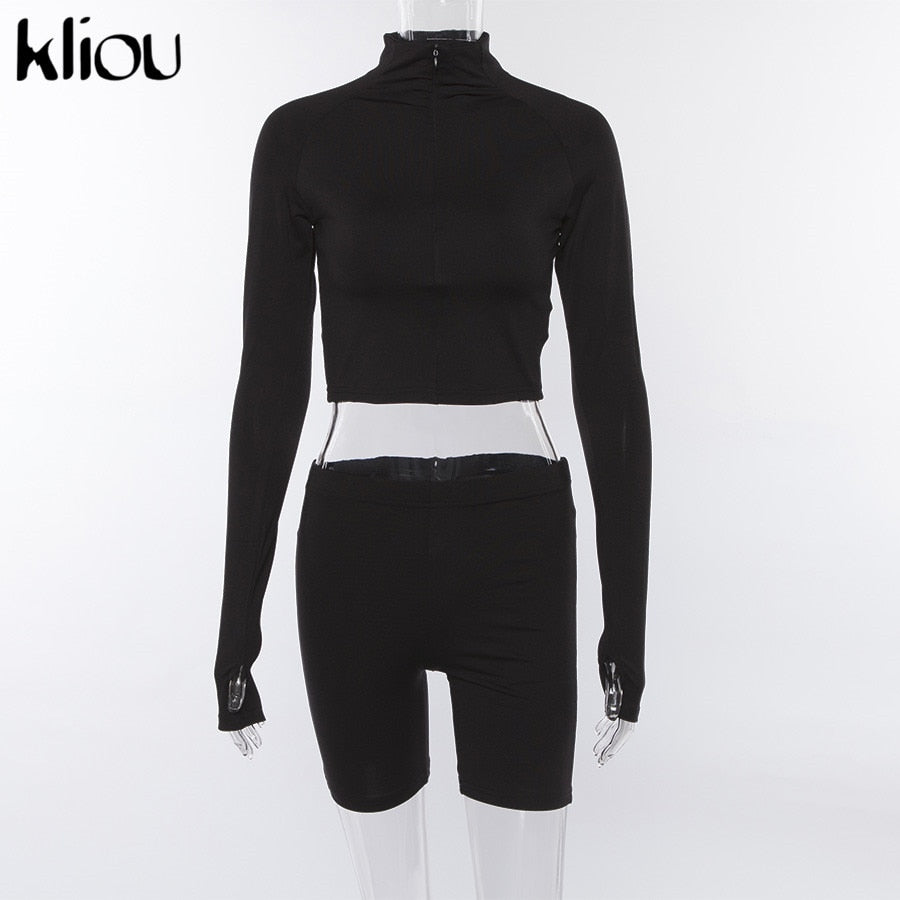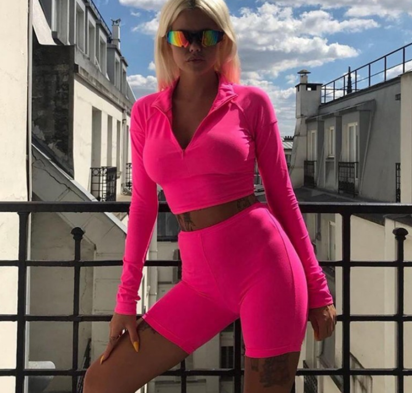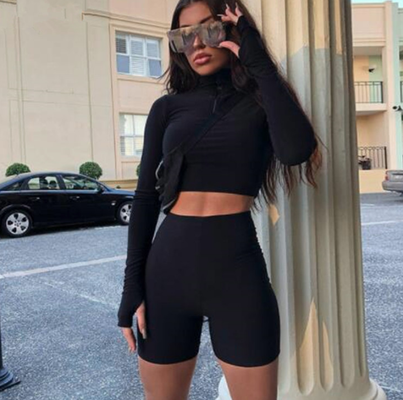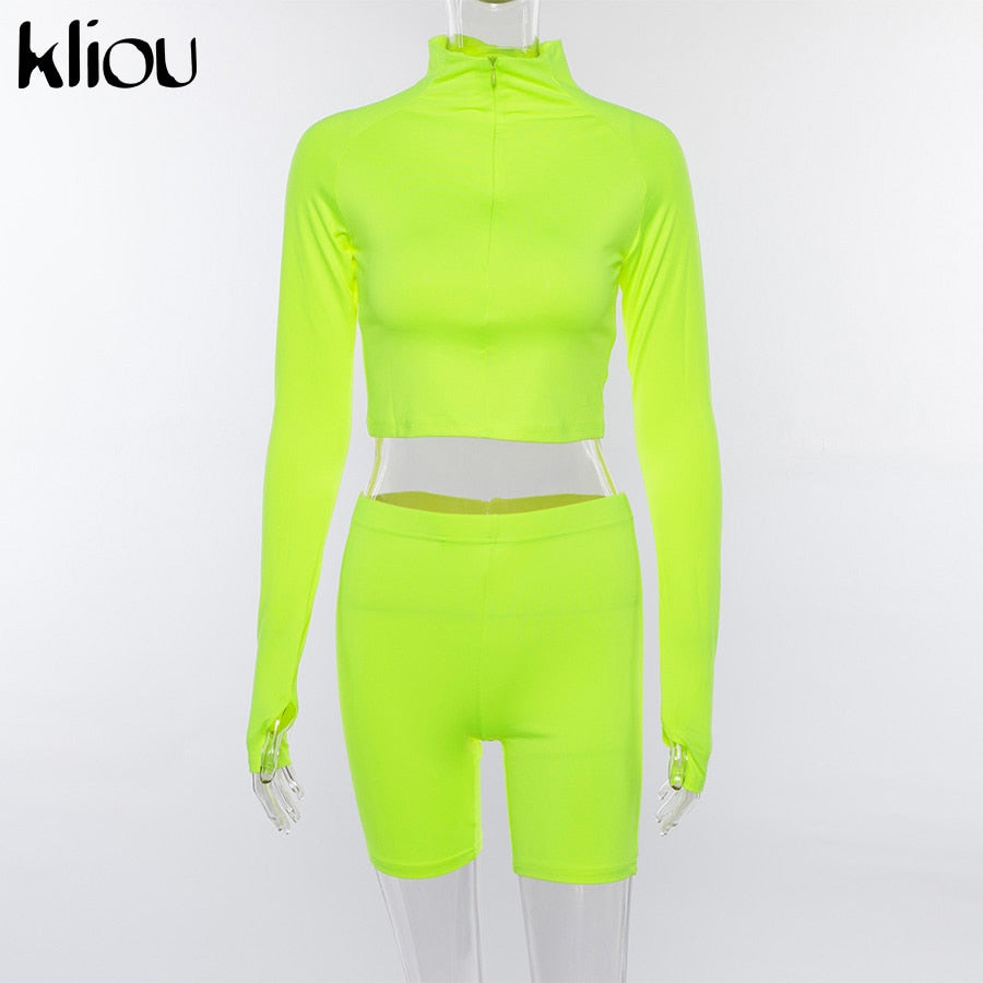 New Female Fluorescence Fitness Two Pieces Sets 2019 Autumn Full Sleeve Zipper Turtleneck Tops And High Waist Shorts Suits