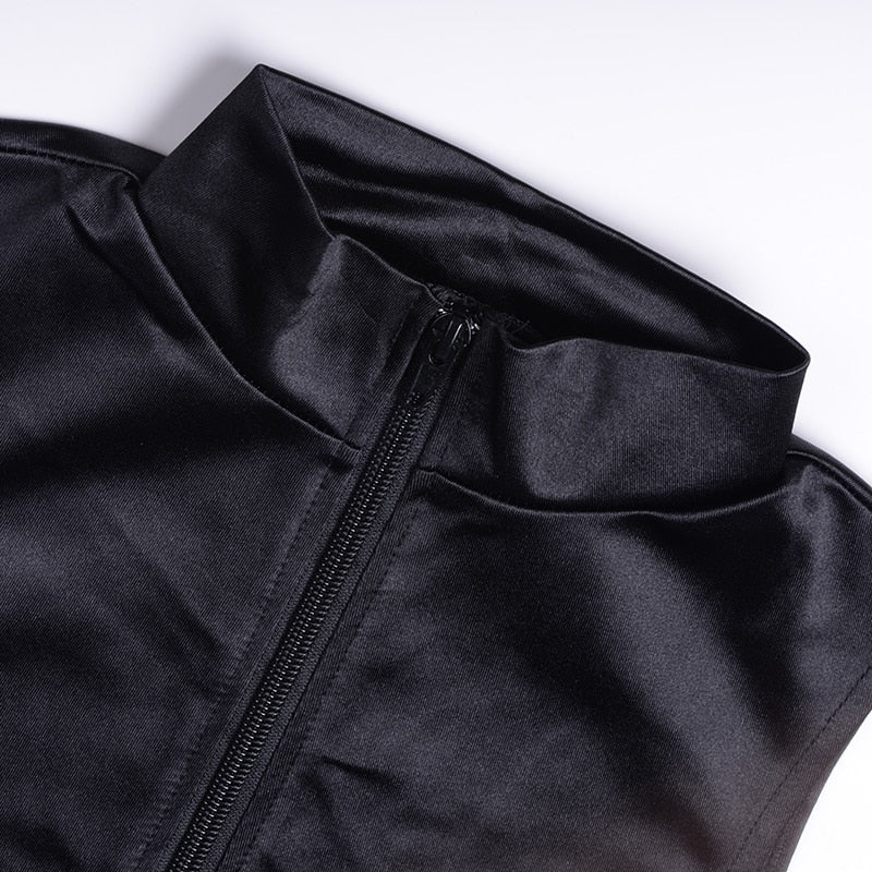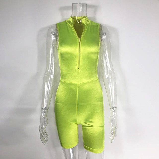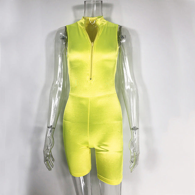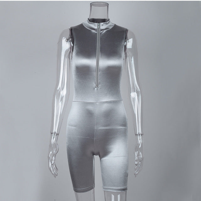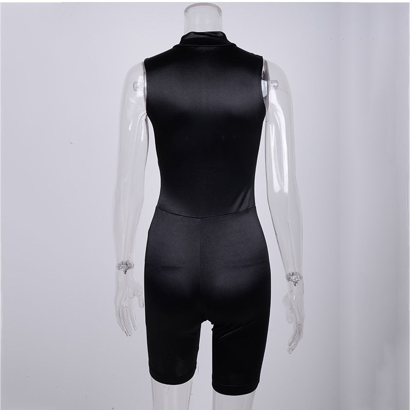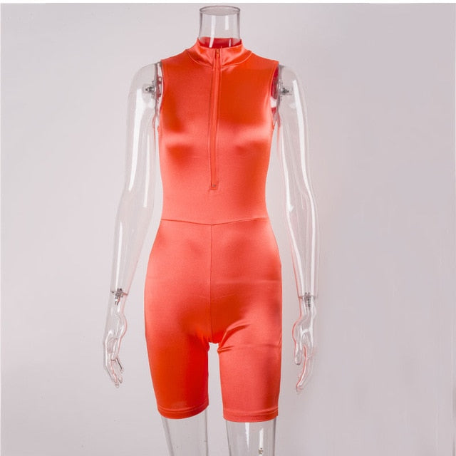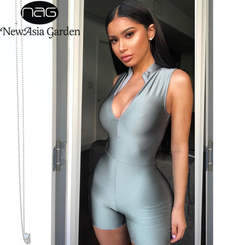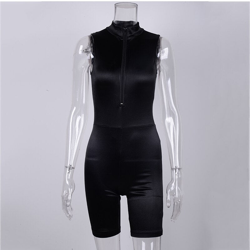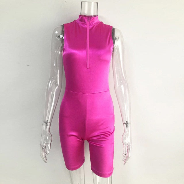 NewAsia Sexy Jumpsuit Summer Elastic Slim Fit Glossy Satin Playsuit Women Fashion Casual Front Zipper Biker Rompers Streetwear
