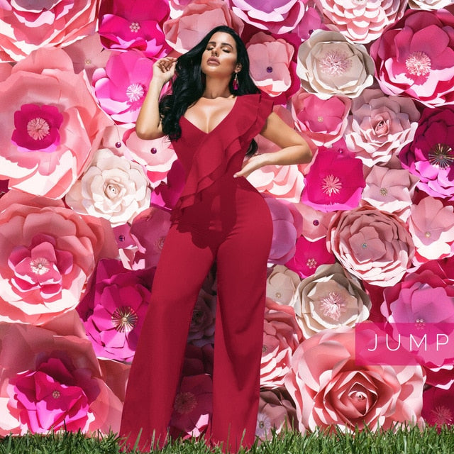 One Shoulder Ruffles Jumpsuits For Women Fashion V Neck Long Wide Leg Pants