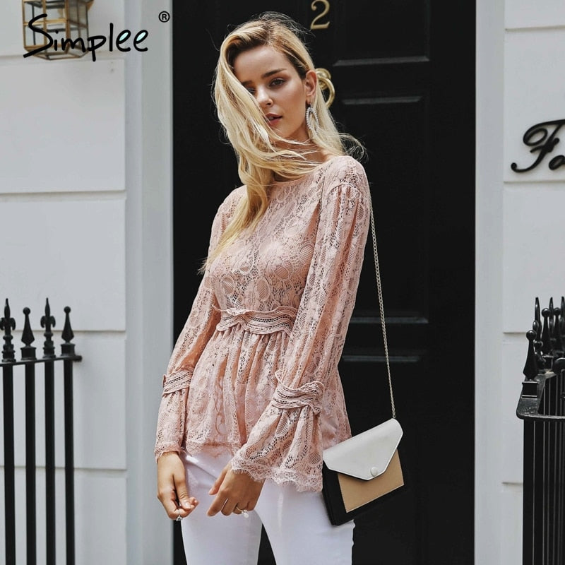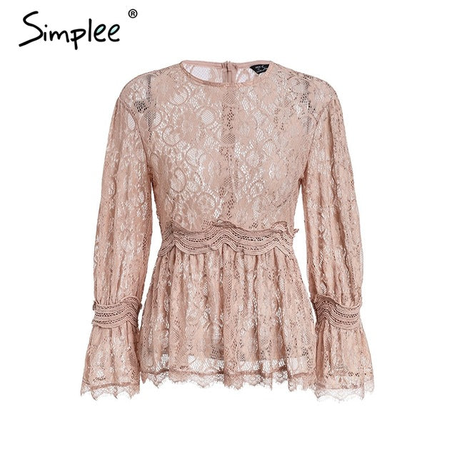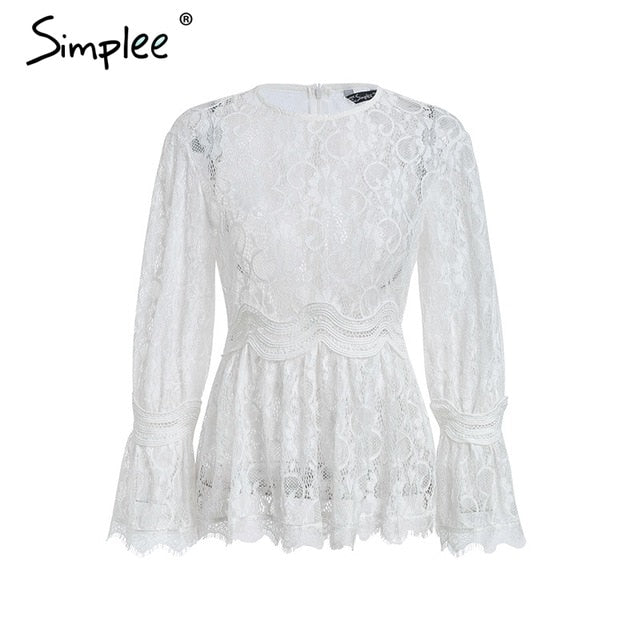 lace embroidery peplum blouse shirt women Elegant ruffles flare sleeve white blouse female Casual hollow out summer tops